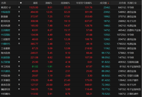 个股分化明显,3028只个股收涨,涨停股71只;2274只个股收跌,跌停股10只。10股单日成交破百亿。其中,寒武纪-U收涨9.01%报1525元/股,已超过贵州茅台股价;CPO概念股“易中天”也表现不错,中际旭创收涨12.05%报494元/股,新易盛收涨7.25%报372.97元/股,天孚通信收涨6.46%报178元/股。阳光电源、宁德时代、工业富联、海光信息、兆易创新亦大幅走高。