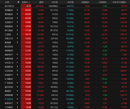 电子股批量涨停,科翔股份、普冉股份、香农芯创、生益电子“20cm”涨停,广合科技、晨丰科技、德明利、汇顶科技等个股也纷纷涨停。