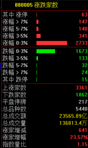 市场共3361只个股上涨,63只个股涨停,1862只个股下跌。