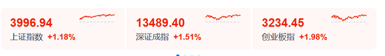 截至收盘,沪指涨1.18%,深成指涨1.51%,创业板指涨1.98%。