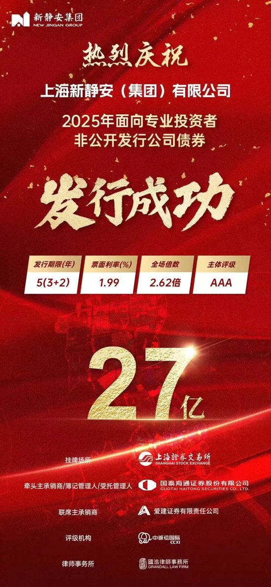 近日,爱建证券作为联席主承销商,助力上海新静安(集团)有限公司(以下简称“新静安集团”)在上海证券交易所成功发行2025年面向专业投资者非公开发行公司债券(第一期)。本期债券发行规模27亿元,期限3+2年,票面利率1.99%,全场认购倍数2.62倍,创新静安集团债券发行票面利率新低,彰显了爱建证券在债券承销领域的专业能力与品牌影响力。