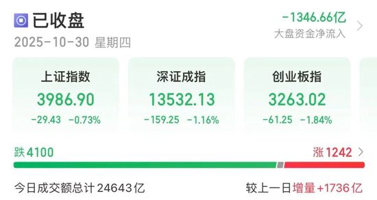 截至收盘,上证指数跌0.73%,深证成指跌1.16%,创业板指跌1.84%。全市场今日成交额超2.46万亿元,较上日放量1736亿元。
