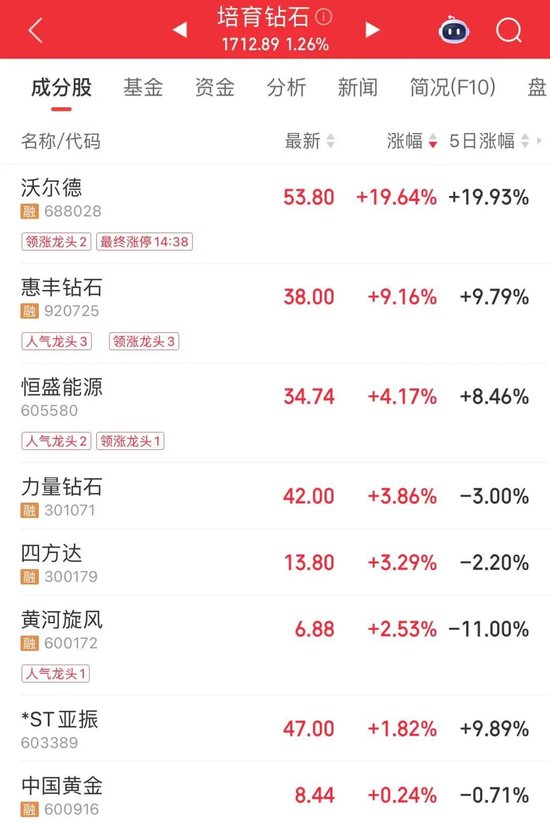 今日午后,培育钻石板块走强。沃尔德盘中“20CM”涨停,截至收盘涨19.64%;惠丰钻石盘中涨超16%,收盘涨9.16%。