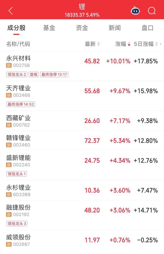 锂矿概念午后大幅拉升,多只龙头股大涨。天齐锂业盘中涨停,截至收盘涨9.67%,最新市值报913.82亿元;永兴材料收盘涨停;赣锋锂业盘中一度涨超9%,收盘涨5.34%,股价报72.37元/股,最新市值为1488.8亿元。