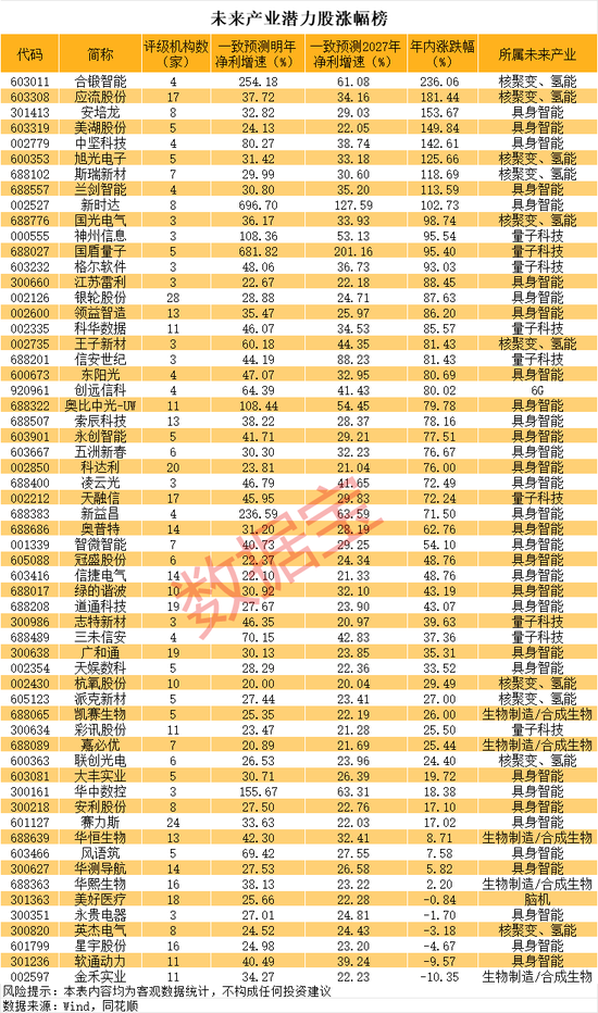 部分公司的成长性值得期待。据数据宝统计,3家及以上机构评级个股中,有59只个股一致预测明年及2027年净利增速均超20%。其中国盾量子、新时达两只个股未来两年机构一致预测净利增速均超100%,合锻智能(维权)、神州信息、华中数控等个股净利增速均超50%。