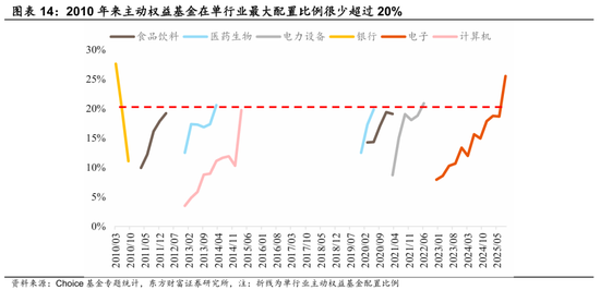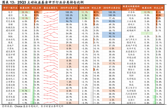 申万二级行业看,通信设备、消费电子、半导体、电池、元件(PCB)增配幅度靠前,主动权益基金对【AI产业链、固态电池/储能】等景气线索的共识进一步强化;白色家电、城商行、白酒、股份制银行、化学制药减配幅度相对靠前,或表明资金对【“两新”政策退坡、红利资产股息率性价比下降牛市弹性相对不足】存在担忧。