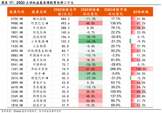 25Q3主动权益基金港股前五大重仓为:腾讯控股、阿里巴巴、中芯国际、信达生物、泡泡玛特。前二十大重仓股中,华虹半导体、药明生物、阿里巴巴等增配幅度(持股总数衡量)靠前。
