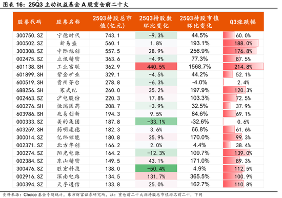 25Q3主动权益基金A股前五大重仓为:宁德时代、新易盛、中际旭创、立讯精密、工业富联。前二十大重仓股中,工业富联、深南电路增配幅度(持股总数衡量)靠前。