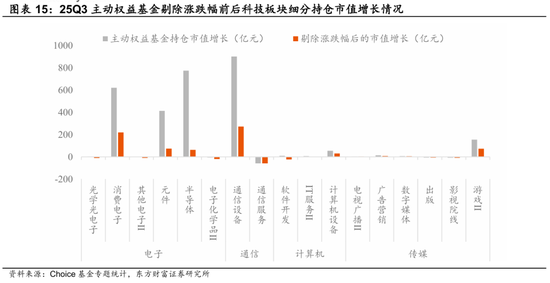 三季度科技板块大幅上攻,剔除涨跌幅影响后,主动权益基金在科技板块内仍大幅加仓通信设备、消费电子、元件、游戏等细分方向。