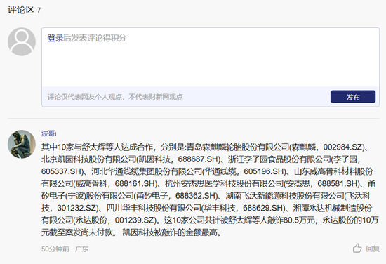 从网友发在财新评论区的截图来看,这12家企业均为行业内知名上市公司,包括青岛森麒麟(002984.SZ)、凯因科技(维权)(688687.SH)、李子园(605337.SH)、华通线缆(605196.SH)、威高骨科(688161.SH)、安杰思(688581.SH)、甬矽电子(688362.SH)、飞沃科技(301232.SZ)、华丰科技(688629.SH)、永达股份(001239.SZ)等。其中凯因科技被敲诈金额最高,永达股份的10万元在案发前未支付。