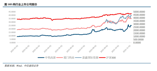 钨行业主要上市公司股价表现大幅跑赢沪深300,中钨高新年初至今涨幅176%,体外柿竹园、远景钨业逐步公告注入上市公司体内。厦门钨业年初至今涨幅85%,钨、稀土、新材料三大主业共振。港股佳鑫国际资源年内8月28日上市,涨幅29%,按照发售价计算,涨幅则已经达到359%,对应的资产为哈萨克斯坦的巴库塔钨矿。