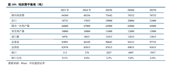 中国钨精矿产量受配额和矿山产能的双重限制。21年之前由于钨精矿价格低迷企业资本开支走弱,几乎没有新建矿山项目,22年钨精矿价格回升后,头部企业开始新建扩建,代表项目包括厦门钨业博白矿和中钨高新的柿竹园项目,这批新项目普遍要27年之后才会逐步投产,因此三年内国内矿山产能基本处于老旧矿山出清和新项目尚未投产接续的紧张期。而从配额的角度看,今年第一批配额缩减6.5%,基本表明了收紧的态度。因此从配额和产能两个角度看,国内的供给都易减难增。