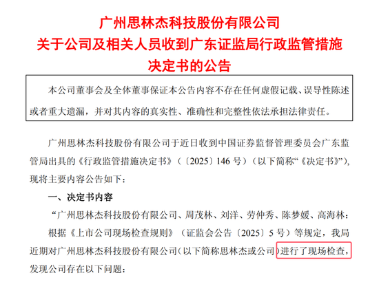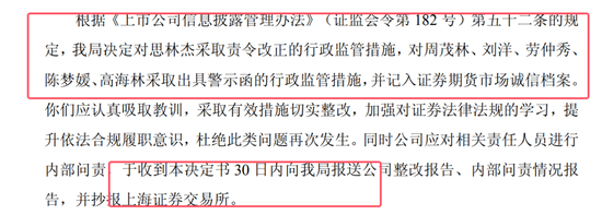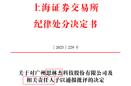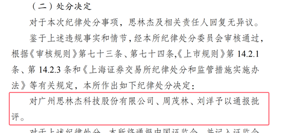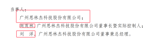 12月 5 日,思林杰发布了关于公司及相关人员收到广东证监局行政监管措施决定书的公告,与此同时,上海证券交易所也向董事长周茂林、董事兼总经理刘洋发出了处罚决定书!