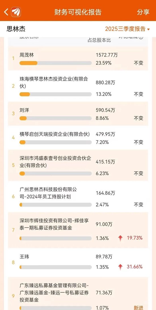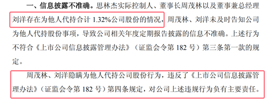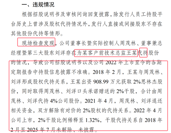 6 、现场检查发现,公司董事长暨实际控制人周茂林、董事兼总经理暨第三大股东刘洋存在为某客户前技术总监王某代持股份的情况,导致公司招股说明书以及公司2022 年上市至今的各期定期报告中持股信息披露不准确。2018 年2 月,王某与周茂林、刘洋形成股权代持关系,王某出资908.99 万元获取2%思林杰股份,同时取得周茂林、刘洋口头承诺赠送的2%干股,合计由周茂林、刘洋代持 4%公司股份。2021 年4 月,周茂林、刘洋退还相关资金,双方解除有对价的 2%股权的代持关系。2022年4月公司上市,2%干股比例稀释至1.32%,干股代持关系自2018年2 月至 2025 年 7 月未解除、未披露。