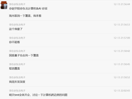 事件起于海光信息的覆盖问题。相关聊天记录显示,李玖发消息要求将海光覆盖从计算机组转回电子组,“海光取消一下覆盖,我来看”“这个我要了”“你不能看”。他还提出,“国盾量子也取消覆盖”“我周末发深度”,同时通知TMT团队全体开会讨论计算机跨边界的问题。
