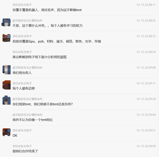 此后,双方争执升级,最终以“合作结束”“明天开会说”告一段落。与此前业内关注的“首席互撕”相比,东北证券两名首席的群内发言用词相对平静,但“有你没我,有我没你”“每个人都有边界”等用词仍透露出火药味。
