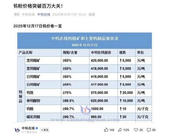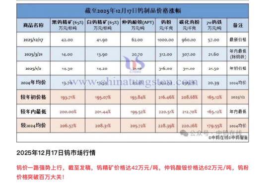 该文显示,2025年12月17日钨市场行情出现罕见强势上涨:钨精矿报价升至42万元/吨;仲钨酸铵价格涨至62万元/吨;钨粉价格突破百万大关。