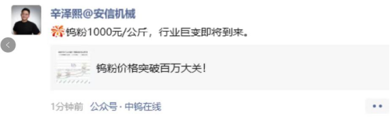 据流传截图显示,辛泽熙在朋友圈转发了中钨在线发布的文章《钨粉价格突破百万大关!》,并写道:“钨粉1000元/公斤,行业巨变即将到来。”
