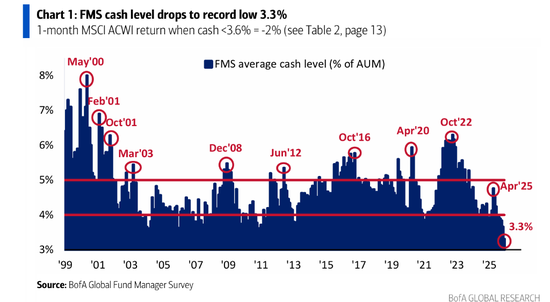 调查数据显示,基金经理的现金配置水平从上个月的3.7%进一步下降至3.3%,创下历史新低。美银指出,当现金水平低于4.0%时,通常被视为反向的“卖出”信号。历史上,当现金水平低于3.6%时,全球股市在随后的一个月内平均回报率为-2%。