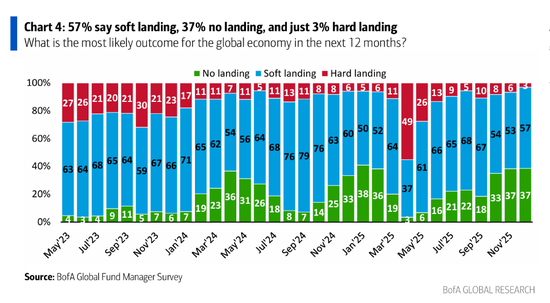 投资者对全球经济前景的看法发生了根本性转变。57%的受访者预计未来12个月全球经济将实现“软着陆”,37%预计“不着陆”(即经济保持增长),而预计“硬着陆”的比例仅为3%,创下过去两年半以来的最低水平。