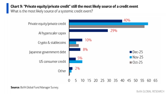 - 信贷风险:40%的投资者认为“私募股权/私人信贷”是最可能发生系统性信贷事件的领域,其次是“AI超大规模资本支出”(29%)。值得注意的是,本月调查中有14%的投资者将“私人信贷”列为未来一年的最大尾部风险。