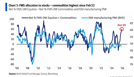 这种乐观情绪直接推高了增长预期。净18%的投资者预计未来全球经济将走强,这是自2021年8月以来的最高水平。与此同时,企业盈利预期也大幅改善,净29%的受访者认为全球企业利润将有所增长。尽管ISM制造业PMI等软数据仍显疲软(11月为48.2),但投资者正押注周期性行业即将在本轮周期中大幅加速。