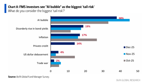 - AI泡沫:仍被视为最大的尾部风险,38%的投资者对此表示担忧,尽管这一比例较上月略有下降。