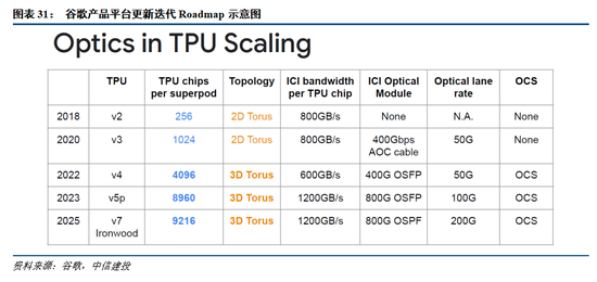 从谷歌的TPU产品演进图来看,从2018年的V2产品开始,到2025年推出的V7 Ironwood,ICI的带宽持续增长。TPU V2产品采用2D Torus架构,单个superpod有256颗芯片,ICI带宽为800GB/s;Ironwood芯片采用3D Torus的网络拓扑架构,ICI带宽为1200GB/s,采用800G OSPF光模块,单个光通道速率达到200Gbps,同时通过OCS来连接。