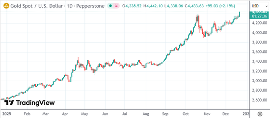 Pepperstone Group Ltd.策略师Dilin Wu表示:“今日的上涨,主要由围绕美联储降息预期的提前布局所推动,并在年底流动性偏薄的背景下被放大。”