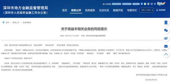 早在2023年2月,深圳市地方金融进度管理局就对鼎益丰相关业务发出风险提示。直言:深圳经营主体不持有金融许可证、不具备从事金融业务的资质。