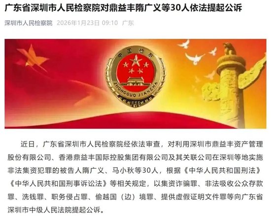1月23日,深圳市人民检察院、深圳福田区检察院分别发布公告称,对利用深圳市鼎益丰资产管理股份有限公司、香港鼎益丰国际控股集团有限公司及其关联公司在深圳等地区实施非法集资犯罪的被告人隋广义、马小秋等30人,以及唐吉强、朱云雷等50人,分别提起公诉。