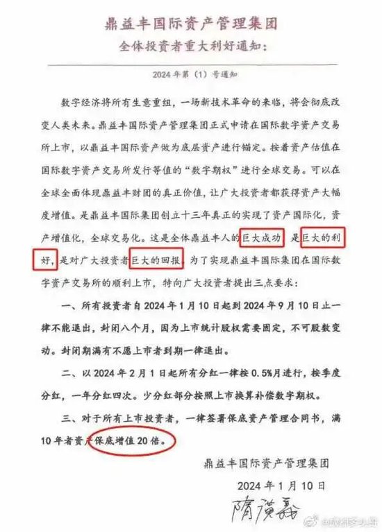 而在2024年初更大面积暴雷,遭大量投资者维权后,鼎益丰还发出“利好”通知,称要向全球发行DDO数字期权,满10年资产保底增资20倍,在境外一个名为“BHE数字交易所”的网站上线,要求所有客户将投资款换成数字期权,封闭三年。