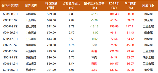 比如今年净值大涨48%的银华内需精选,就是长期全面聚焦黄金股。