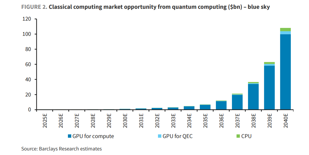 这不再是竞争,而是共生。 量子计算机越强,对英伟达、AMD芯片的需求就越爆炸。巴克莱测算,这种“伴生需求”在蓝天情景下,到2040年将给经典计算市场带来超过1000亿美元的增量。