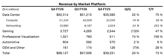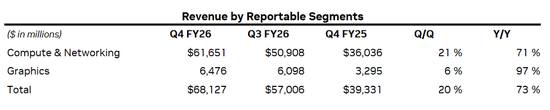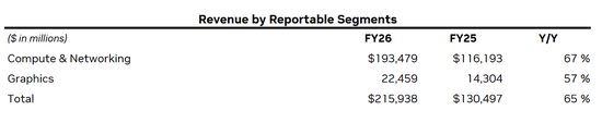 2026财年全年,按可报告部门来看,英伟达的计算与网络部门贡献了1934.8亿美元的营收,同比增长67%。计算机图形部门贡献了224.6亿美元的营收,同比增长57%。