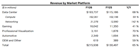 同期,按市场平台来看,英伟达数据中心业务实现了1937.4亿美元的营收,同比增长68%。其中,数据中心计算业务贡献1623.6亿美元的营收,同比增长59%;数据中心网络业务贡献313.8亿美元的营收,同比增长142%。游戏业务实现160.0亿美元营收,同比增长41%。