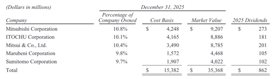 伯克希尔在三菱、伊藤忠和三井的持股比例已相继跨越10%的门槛,丸红和住友的持股占比也距10%一步之遥。这种“高分红、稳增长、本币对冲”的模式,在美股估值高企的当下,为伯克希尔的巨额资本提供了一个极具韧性的蓄水池。