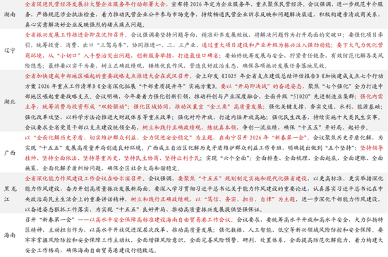 广东、浙江、江苏多地召开“新春第一会”,锚定“十五五”开局之年,定基调、把方向、抓落实,多聚焦新质生产力、民营经济、高质量发展等。其中,广东、安徽、江苏等地聚焦科技创新与高质量发展,福建、湖南聚焦民营经济发展,浙江(“八八战略”、共同富裕)、湖北(中部地区崛起)、海南(自贸港)、江西(农业农村)等各有侧重,主题虽有不同,但多提及鼓励低空经济、具身智能、无人驾驶等新兴产业发展;此外,浙江、辽宁、湖北、黑龙江多地继续强调树立和践行正确政绩观。