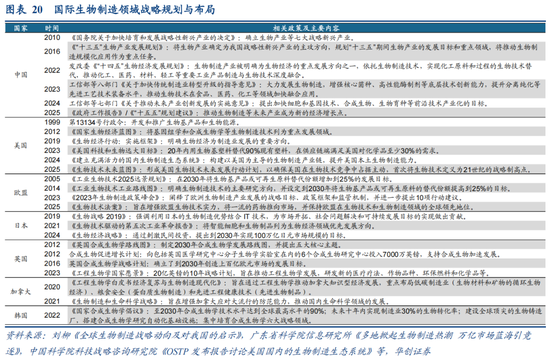 各国支持政策密集出台,中国以地方产业支持政策为主。据不完全统计,目前全球已有超过60个国家和地区发布了发展生物制造或生物经济的相关政策。美国在生物制造领域长期占据领先地位,其政策规划保持较强延续性,布局紧密围绕巩固技术领先优势和强化产业链安全,早在2012年就发布《国家生物经济蓝图》将以基因组学、合成生物学为代表的生物制造技术作为重点发展领域加以支持,且近年来出台一系列政策以推动生物制造产业保持国际领先地位。欧盟高度重视生物技术和生物制造产业发展,制定了一系列针对性行动规划,旨在推动农业、林业、能源、食品和饲料及工业的现代化,推动绿色和数字化转型。中国生物制造虽然起步较晚,但在国家政策支持下,从“十三五”时期的起步布局,走向“十四五”时期的深化发展和战略提升阶段,再到“十五五”规划中列入未来产业,有望逐步成为新的经济增长点。同时,当前产业政策支持仍主要集中于地方政府层面,顶层战略设计与统筹协调仍有待完善,截至2025年3月我国31个省市区中已有28个地区在相关政策中明确提出支持合成生物/生物制造产业发展,未来应基于统一大市场谋划,指导地方差异化布局,避免低水平重复建设与资源浪费,构建健康的生物制造产业生态。