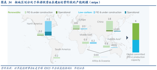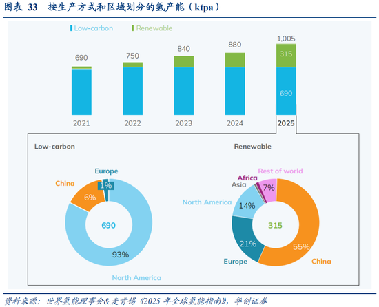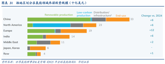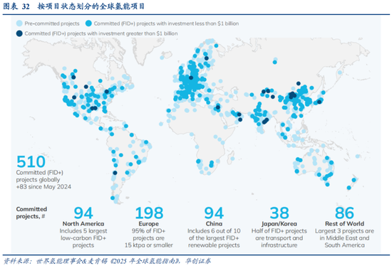 中国资金投向侧重可再生能源制氢,美国侧重低碳制氢。全球清洁氢能产业已度过初期研发阶段,正在进入以项目落地为核心的高速发展期。根据世界氢能理事会&麦肯锡《2025年全球氢能指南》,当前中国在氢能领域的承诺投资规模达到330亿美元,约占全球承诺投资总规模的30%,较24年增长60亿美元;美国承诺投资规模约为230亿美元,占比约为21%。从结构上来看,中国近半数氢能投资集中于可再生能源制氢,另外约1/4投资规模集中于终端应用相关领域;美国近半数氢能投资则集中于低碳制氢,表明中美在技术路线上存在差异。此外欧洲、印度等地则更加侧重于终端应用相关的投资。从具体氢能项目来看,截至2025年7月约510个项目处于承诺投资阶段,较2024年5月增长83个,全球氢能总管线规模较2020年扩大约7.5倍。从项目分布来看,欧洲项目数量最多达到198个(占比38.8%)但大部分均为小型项目;美国和中国项目均为94个且以大型项目为主,其中规模最大的可再生能源制氢项目中60%位于中国,而最大的低碳制氢项目中有5个位于美国。