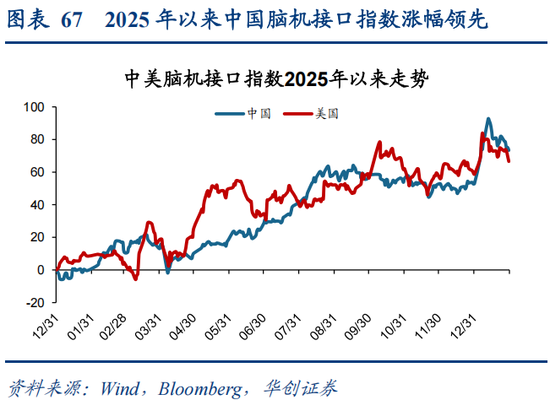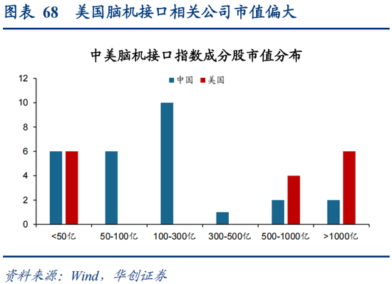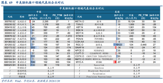 2025年至今中国脑机接口指数股价涨幅领先。由于美股中不存在脑机接口指数,我们选取了16家美股中与脑机接口概念相关的上市公司构建等权指数,并与万得脑机接口概念指数做对比分别用以衡量中美资本市场中脑机接口相关上市公司表现。中美脑机接口指数当前总市值分别为0.7万亿元与17.7万亿元(成份股平均市值272亿与11086亿);成份股PE_TTM中位数分别为118.9倍与44.4倍(剔除负数);成份股2024年净利润增速中位数分别为-11.6%与15.4%;2025年以来累计涨跌幅分别为73.4%与66.6%,整体来看中国相关领域上市公司市值偏小/估值偏高/业绩增速偏低/涨幅领先。