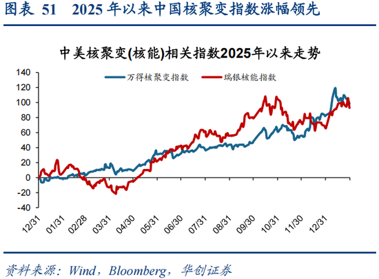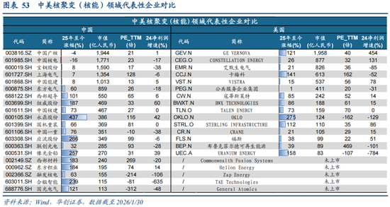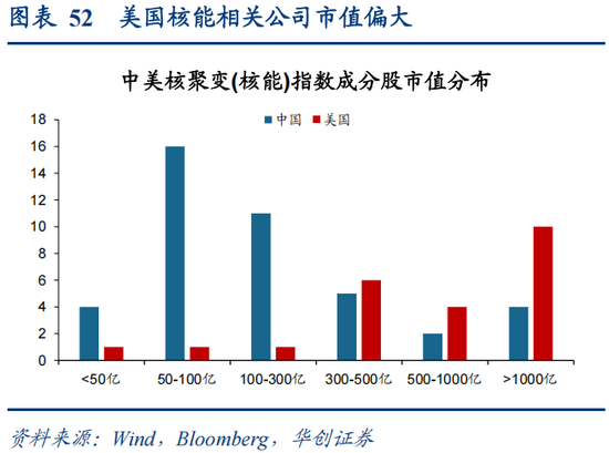 2025年至今中国核聚变指数涨幅领先。根据万得核聚变指数与瑞银核能指数(由于不存在刻画美股核聚变概念的指数且美股中可控核聚变技术领域相关公司数量较少,以跟踪美股核能产业的瑞银核能指数作为替代),截至2026/1/30中美两国可控核聚变(核能)领域相关上市公司分别为42只与23只;总市值分别为1.4万亿元与4.8万亿元(成份股平均市值343亿与2066亿);成分股PE_TTM中位数分别为52.7倍与42.3倍(剔除负值);成份股2024年净利润增速中位数分别为0.2%与-13.3%;2025年以来累计涨跌幅分别为98.7%与92.9%,中国股价涨幅领先且波动更小。整体来看中国相关领域公司市值偏小,市值分布大部分在50-300亿之间,而美国公司多数为市值大于1000亿元的能源巨头;从盈利估值来看,中美上市公司估值相差不大,但中国公司业绩增速较高。