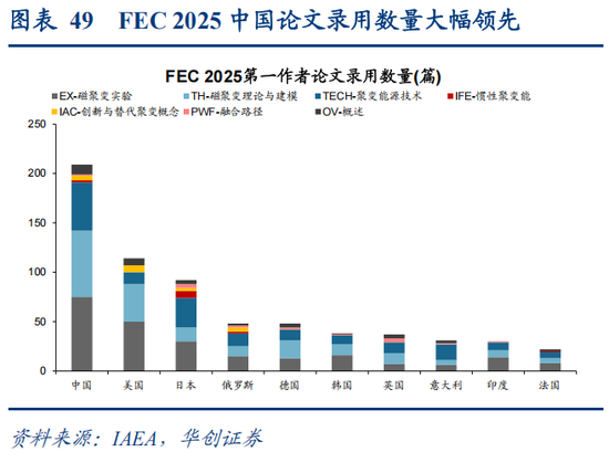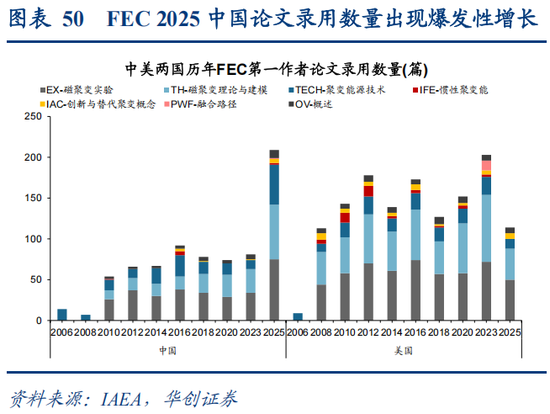 中国科研实力产生实质性飞跃。根据第30届国际原子能机构聚变能源会议(FEC 2025)第一作者论文录用数量来看,中国论文数量达到209篇,占比达到27%,大幅领先第二名美国114篇,第三名日本92篇。从论文方向上来看,磁聚变实验、磁聚变理论与建模、聚变能源技术等关键领域中国论文占比均处于30%附近且远超美、日等传统强国。此外,从历届FEC论文录用数量来看,过去二十年中美国一直保持领先水平,中国相对处于落后地位进展缓慢,但这一趋势在2025年发生逆转,中国论文数量同比2023年增长158%达到209篇远超美国,意味着中国在核聚变领域的科研数量与质量均出现明显提升,技术路线得到国际认可的同时,标志着中国核聚变科研国际地位的实质性跃升并跻身世界前列。