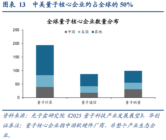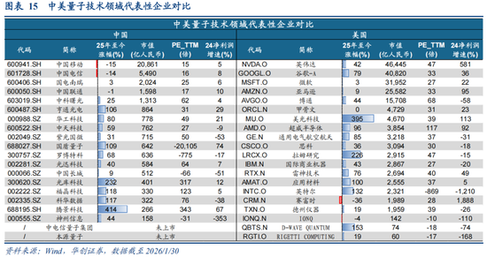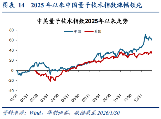 核心企业数量中美双强,2025年至今中国量子科技指数涨幅领先。根据光子盒研究院统计,截至2024年底全球量子领域相关企业已经突破800余家,其中核心企业(中游软硬件厂商)数量约380家,量子计算核心企业数量达到194家,占比超过半数达到51%。从企业国别来看,全球量子核心企业分布主要集中在中国(89家)和美国(91家),两者合计占比达到47%,其中中国在量子测量领域数量领先,美国在量子计算与量子通信领域数量领先。从上市公司资本市场表现来看,根据万得(美国)量子技术概念指数,截至2026/1/30(下同)中美两国量子领域相关上市公司分别为48只与38只;总市值分别为4.2万亿元与151.3万亿元(成份股平均市值867亿与4.0万亿);成份股PE_TTM中位数分别为63.7倍与30.3倍(剔除负数);成份股2024年净利润增速中位数分别为7.6%与7.3%;2025年以来累计涨跌幅分别为61.1%与34.6%。整体来看在利润增速相近的情况下,中国量子科技领域上市公司整体市值偏小但估值偏高,2025年至今两国相关公司资本市场表现联动较强,股价走势趋势较为接近。