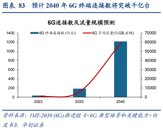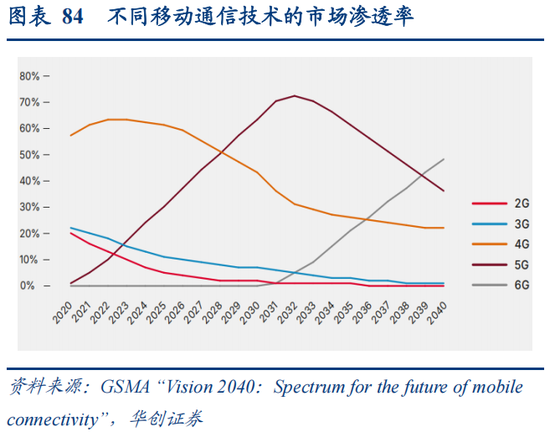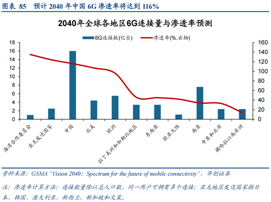 “万物智联”的新一代数字信息基础设施。第六代移动通信技术(6G)是继5G之后的新一代全球移动通信标准,其内涵远超传统通信技术的范畴,它不仅仅追求网络性能指标的提升,更是一个集通信、计算、感知、人工智能、安全等能力于一体的融合性信息服务网络,推动5G时代的“万物互联”向“万物智联”跃迁,成为连接真实物理世界与虚拟数字世界的纽带和未来社会运行的神经网络。根据IMT-2030(6G)推进组预测,面向2030年商用的6G网络中将涌现出智能体交互、通信感知、普惠智能等新业务新服务,预计到2040年6G各类终端连接数相比2022年增长超过30倍,月均流量增长超过130倍,最终为6G带来“千亿级终端连接数,万亿级GB月均流量”的广阔市场发展空间。根据《中国互联网发展报告2025》预测,到2030年中国6G市场规模有望突破1.2万亿元,其中工业互联网应用占比达40%,智慧城市应用占比30%。此外,根据全球移动通信系统协会(GSMA)预测,2030年后6G的全球市场渗透率将快速提升并在2040年达到54%,部分地区如海湾合作委员会成员国、亚太发达国家、中国、北美等渗透率将超过100%。