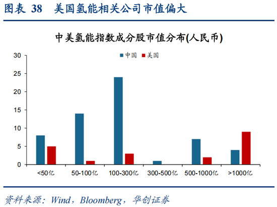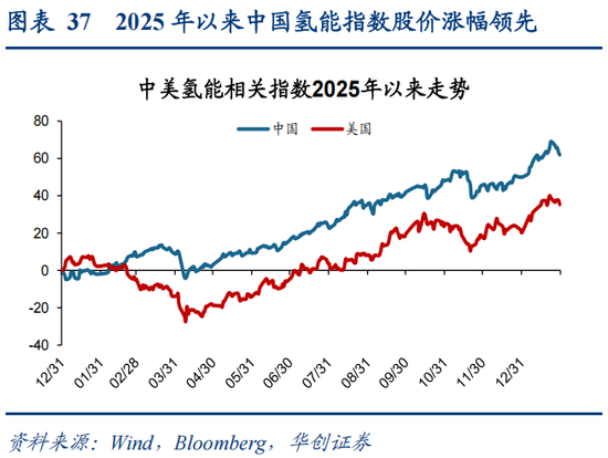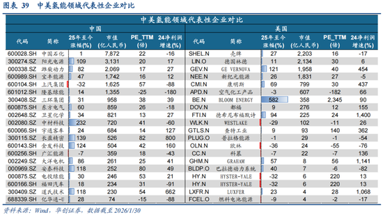 2025年至今中国氢能指数股价涨幅领先。由于美股中不存在刻画氢能领域的指数,我们以标普Kensho氢经济指数成份股与彭博氢能综合指数中的美国成份股构建等权指数(共计20家成份股),并与万得氢能概念指数做对比分别用以衡量中美资本市场中氢能领域相关上市公司表现。截至2026/1/30中/美氢能指数总市值分别为1.8与7.5万亿元人民币(成份股平均市值303亿与3726亿);成分股PE_TTM中位数分别为40.6与30.1倍(剔除负数);成份股2024年净利润增速中位数分别为-7.2%与46.1%;2025年以来累计涨跌幅分别为61.9%与35.3%。整体来看,中国氢能领域相关上市企业市值偏小,估值偏高,业绩增速偏低,2025年以来指数涨幅领先。