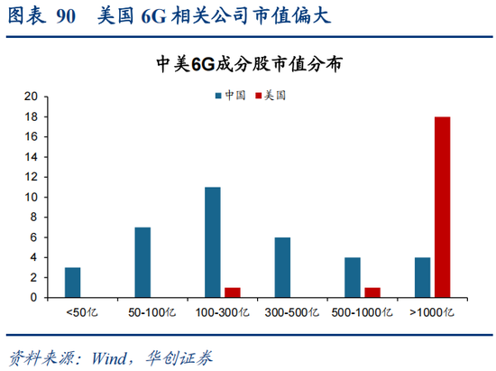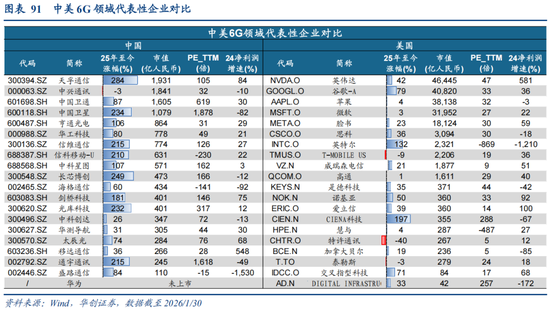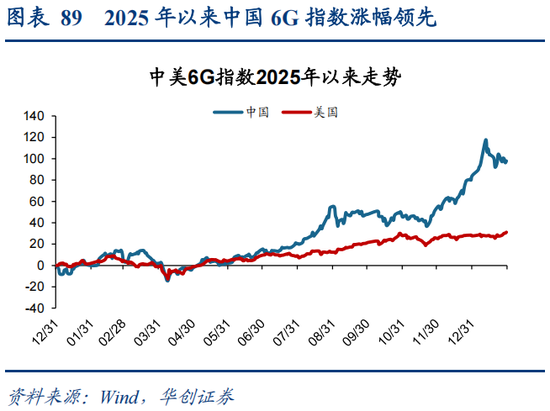 2025年至今中国6G指数股价涨幅明显领先。由于美股中不存在6G相关概念指数,我们选取了20家美国Next G联盟中的核心上市公司构建等权指数,并与万得6G概念指数做对比分别用以衡量中美资本市场中6G相关上市公司表现。中美脑机接口指数当前总市值分别为1.5万亿元与131.8万亿元(成份股平均市值419亿与6.6万亿);成份股PE_TTM中位数分别为108.2倍与29.5倍(剔除负数);成份股2024年净利润增速中位数分别为18.5%与24.6%;2025年以来累计涨跌幅分别为98.0%与31.2%,整体来看中国相关领域上市公司市值偏小/估值偏高/业绩增速偏低/涨幅领先。