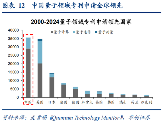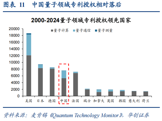 专利申请数量领先但授权数量相对落后。根据麦肯锡统计,2000-2024年中国在量子领域共获得7601件专利授权,约占全球的11%(美国27%、欧盟27%、日本14%),其中量子通信领域专利授权数量近年来增加显著,合计达到2232件仅次于美国。从专利申请数量上来看,中国已处于全球领先地位与美国并驾齐驱,2000-2024年申请数量达到35540件,约占全球28%(美国28%)。其中在量子计算领域申请数量超过美国处全球第一,但在量子通信与量子测量方面稍逊一筹。