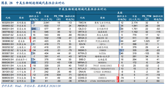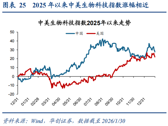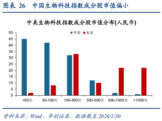 2025年至今中美生物科技指数股价涨幅相近。根据万得构建的生物科技概念指数,截至2026/1/30中美两国生物科技领域相关上市公司分别为134只与97只;总市值分别为1.9万亿元与11.3万亿元(成份股平均市值145亿与1163亿);成份股PE_TTM中位数分别为51.6倍与25.4倍(剔除负数);成份股2024年净利润增速中位数分别为-4.9%与3.2%;2025年以来累计涨跌幅分别为27.6%与22.0%。整体来看中国相关领域公司多为小市值低盈利高估值公司,市值分布大部分在100亿元以下,而美国更多为估值相对合理、盈利稳定的大型跨国企业巨头,近半数市值大于500亿元。2025年至今两国股价走势相关性较弱,中国生物科技企业受益于政策支持下审批提速、创新药出海BD交易活跃等因素前期涨幅明显领先。9月以来受中美政策与事件驱动分化(中国医保谈判结果不及预期导致药企盈利预期大幅下调;美国FDA审批加速、美联储降息流动性改善)导致两者涨幅差异明显收窄。