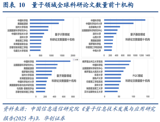 科研论文数量中国已处全球领先地位。当前中、美、欧在量子信息四大领域(量子计算、量子通信、量子精密测量,以及与量子信息关系密切的抗量子加密PQC)科研论文数量均占据前列。根据麦肯锡统计,2024年中国在量子信息领域的科研论文占全球比重达到41.8%,较23年提升7.3pct,远超美国17.6%与欧洲17.3%,其中量子通信领域我国论文数量明显领先于其他国家。